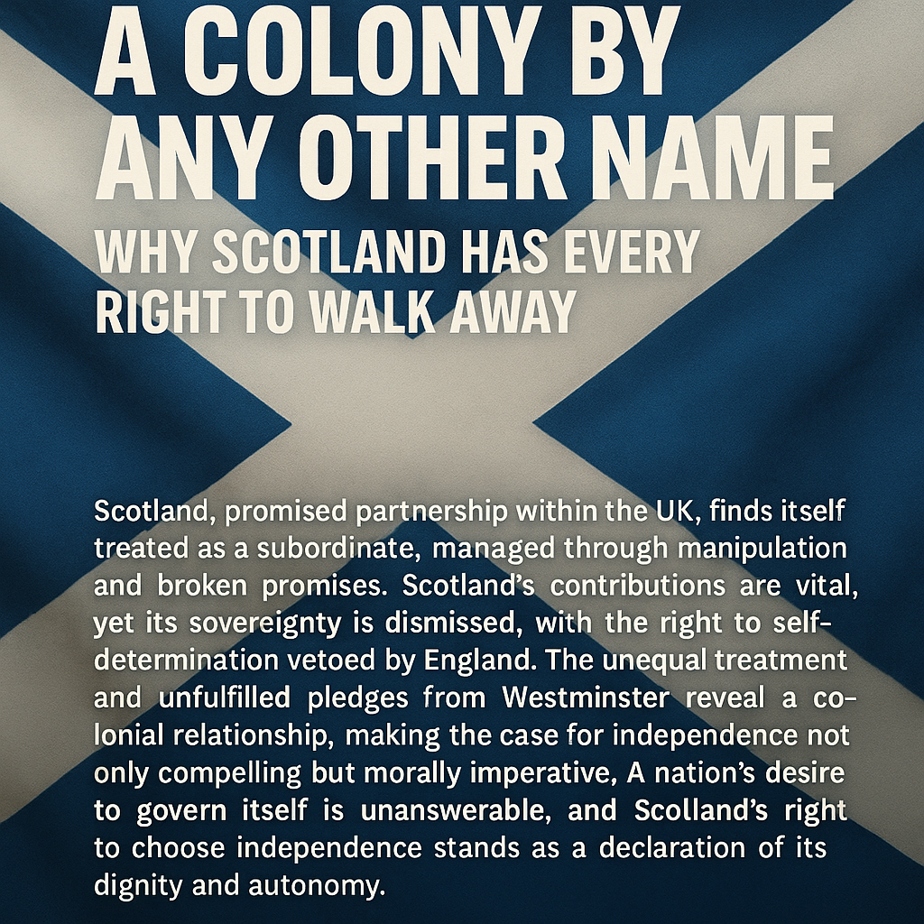 A nation cannot be held in a union by force, not without exposing the entire arrangement as a colonial relic dressed up in modern branding. Scotland asked in good faith to determine its future. England said it already had. Scotland asked again. England said no. Scotland may ask again. The answer will likely always be the same. At some point, it stops being a disagreement and becomes an indictment. If Scotland wants independence and England refuses even to let it ask the question, then Scotland is a colony: politically, constitutionally, and democratically and like every colony throughout history, Scotland has one inalienable truth on its side: A people cannot be denied forever.