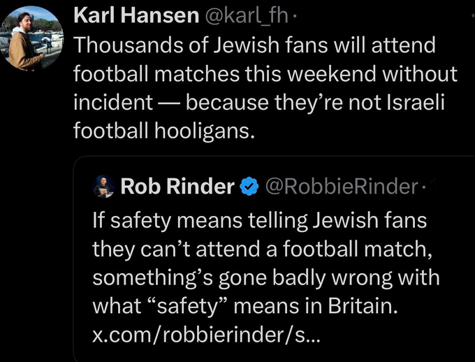 So now our politicians are losing their shit because Birmingham has the sheer audacity to not want the out of control racist fuckers that follow Maccabi Tel Aviv in their city. Everyone from all parties has been wheeled out for this and of course they are screaming antisemitism again when of course it is nothing of the sort. Kemi Bad Enoch, someone who has probably never been to a football match in her life jumped on the bandwagon and chirped in with “Will he [Starmer] back those words with action and guarantee that Jewish fans can walk into any football stadium in this country? If not, it sends a horrendous and shameful message: there are parts of Britain where Jews simply cannot go”. This deliberately conflated being Jewish in Britain with being a far right football thug from Israel. And Kemi by the way, Jews go to football matches every fucking week, Jews from North London - why do you think Spurs shout 'Yid Armeee'. But Jews in Manchester, Liverpool and Glasgow too - not one of them is impeded from visiting a football match if they want to, and quite frankly stirring the shit Kemi, you should made to lick the spoon - if you weren't so lacking in self awareness, you'd realise your statement was in itself fucking antisemitic.