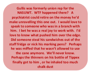 Stoke, I mean come on – what the fuck were you thinking? Even Ruth Smeeth, at her lynching black activist Chris Wadsworth worst, was better than this piece of lumpy arse gravy. And she train-wrecked a whole political party. Anyway, apologies for veering off a bit. As an Education Minister during a huge wave of strikes you’d think that he’d have been wanting to find a road map to resolution. But no – that’s not the Gullis way. His first salvo was to blast the leaders of the National Education Union as Bolshevik and Commie. After irrationally blasting the union leaders he gaslit that teachers, who last went on large scale strikes 12 years ago, ‘strike at the drop of a hat’ Hardly conducive to conciliation and indicative of the way this strike panned out. As an aside, this man in charge of Educating our kids put his Lower Second Class Honours (2:2) – that’s the one you get for just turning up - from Oxford Brookes (that’s the one in Oxford that isn’t part of Oxford Uni) to good use. He was formerly a teacher in Sutton Coldfield at the Fairfax Academy, Blackfen Girls School and Ashlawn School. In anyone’s book, that’s got to be child abuse. Putting this reactionary ring-piece in charge of children.