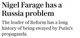 Of course the Kremlin doesn't need a signed contract with Farage. It doesn't need to fund Reform UK Ltd directly, although in most likelihood it does. Influence does not work like that anymore. Modern destabilisation is not about spies in trench coats. It is about soft alignments: useful idiots, ideologues, opportunists and media ecosystems that play into your hands without ever needing a handshake. Farage fits that mould perfectly. Whether he is consciously aligned with Putin’s agenda is irrelevant. The effect is the same. Reform UK Ltd pushes narratives that mirror the Kremlin’s foreign propaganda almost word for word. Here are a few of the greatest hits: