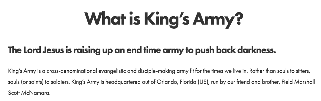 The King’s Army my be a Third Temple End of Times Death Cult, but is not a local sect of oddballs - it is part of an orchestrated ideological campaign, with the British branch learning from Phoenix, Texas and Washington DC via online propaganda, funding, street theatre and political infiltration. We must stop pussy-footing around with euphemisms such as ‘religious conservatism’ or ‘traditional values’. We should call it what it is: This is fascism wearing a crucifix. The King’s Army ticks every box you’d expect of a classic fascist formation:
