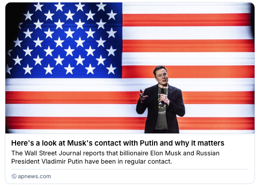 As for Musk in dialogue with Putin. Well he's been doing that for 2 years now. Two years when Russia has been involved in a war in Europe. Musk doesn’t just 'happen' to chat with Putin. For two years he’s been circling around the Kremlin like some self-appointed geopolitical guru, drifting between back-channel peace plans that conveniently favour Russian territorial grabs and public statements that undermine Ukraine’s position and push the bro-tech toxic ideology of Curtis Yarvin that he's wholeheartedly bought in to. And the question isn’t why would Putin want to talk to Musk, it's really why wouldn't he? Musk owns critical comms infrastructure, has a messianic ego and can sway markets, politicians and the media with a single deranged tweet. He’s useful to Putin. As for Musk? well Putin flatters him because he thinks he belongs at the top table with strongmen and presidents. Because he imagines himself a kingmaker, a sort of Silicon Valley Henry Kissinger without the intellect, ethics or understanding of geopolitics, and because cosy chats with Putin feed the delusion that he’s the one man who can 'solve' global crises, even when his solutions amount to rewarding aggression. It’s not diplomacy. It’s not statesmanship. It’s a billionaire with too much power, too little accountability, and a dangerous fascination with autocrats, and that’s precisely why the EU and NATO, behemoths though they may be, are essential. They’re the only things big enough to stop men like Musk and Putin turning the world into their private playground.