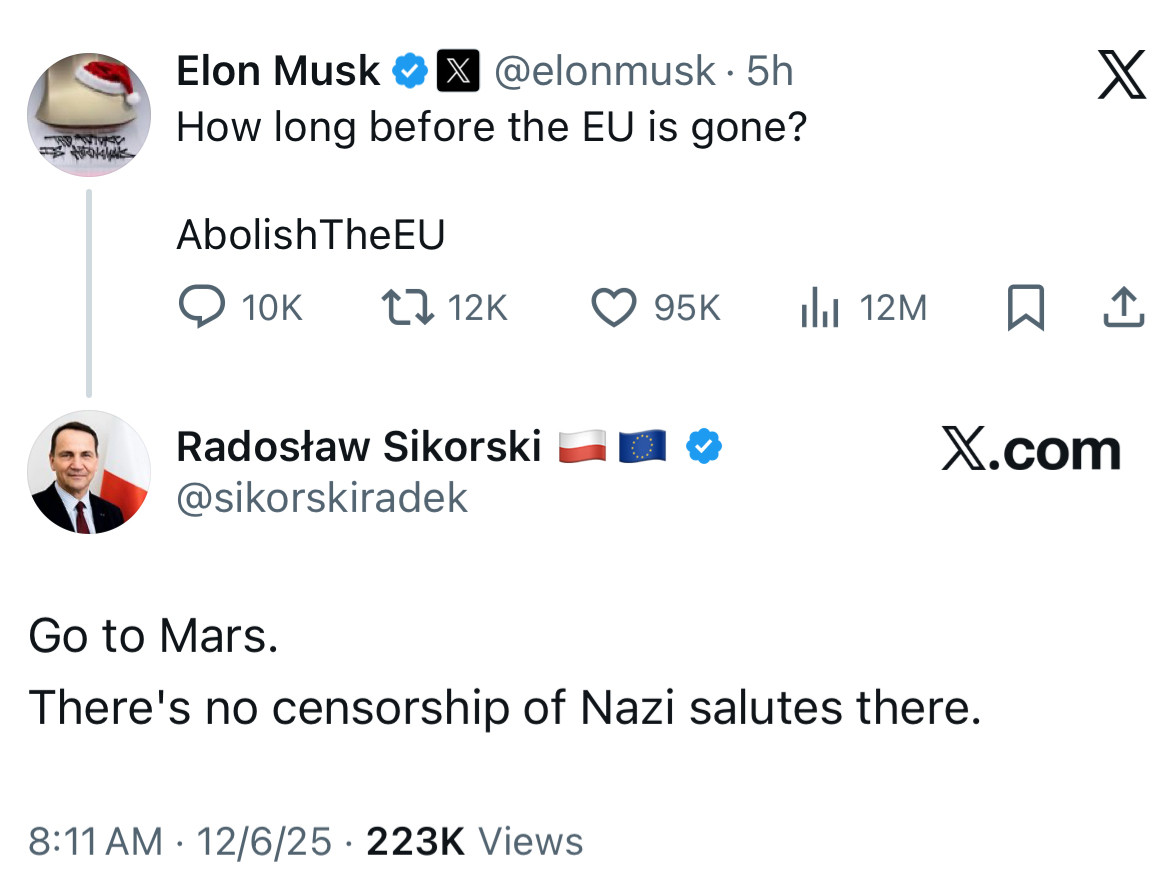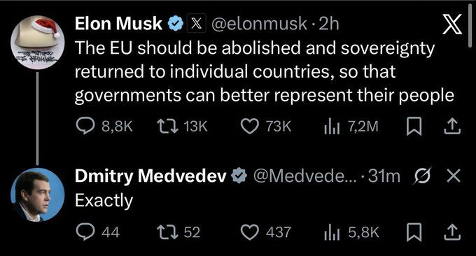 Medvedev tweeting ‘Exactly’ under Musk’s post should chill anyone with an understanding of modern geopolitics. This is not some random backbencher or a fringe crank. This is the former president of Russia, one of the top men in a regime currently invading a sovereign European nation, threatening nuclear escalation and openly declaring its intent to rewrite the post-Cold War world order. For Medvedev to endorse Musk is not a coincidence. It is a signal. It is affirmation that Musk’s argument aligns with Russian strategic goals because if Europe is splintered, if its members are isolated, bickering, and vulnerable then Russia has carte blanche to do whatever it wants. It wins economically, militarily, diplomatically and let’s not forget: Musk directly intervened in the war in Ukraine. He provided Starlink access, briefly considered cutting it, shoved his ‘peace plan’ down the world’s throat (one that conveniently involved appeasing Russia) and then acted wounded when anyone dared question his motives. He behaves like a man who thinks sovereignty is a toy, something other people have to worry about, while he plays emperor from the comfort of his billionaire bunker. So yes, Medvedev saying ‘Exactly’ is significant. It is not just agreement, it is recruitment. It is the Kremlin co-signing the world’s richest man and if that doesn’t terrify you, you're not paying attention.